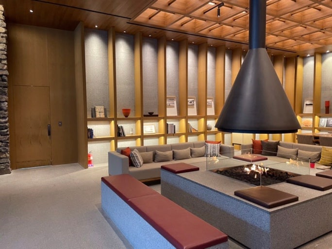 - 1층 라운지 카페에서 전면 통창 너머 숲뷰 감상 가능